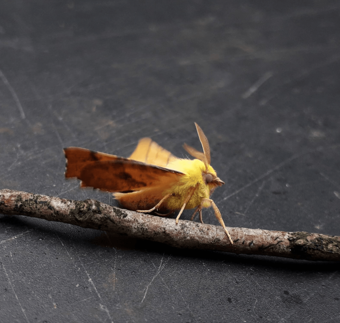 The Early Thorn (left) and Canary-Shouldered Thorn (right) are both part of the Thorn family which often hold their wings upright like a butterfly. The Canary-Shouldered Thorn is a beautiful, brightly coloured moth which can be found in the autumn time.